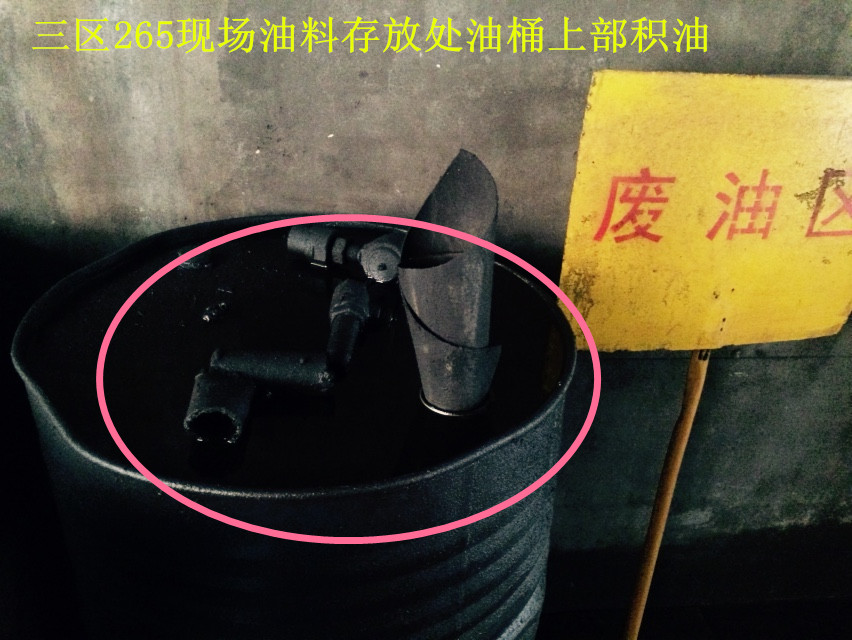 1、三區(qū)265現(xiàn)場油料存放處油桶上部積油;