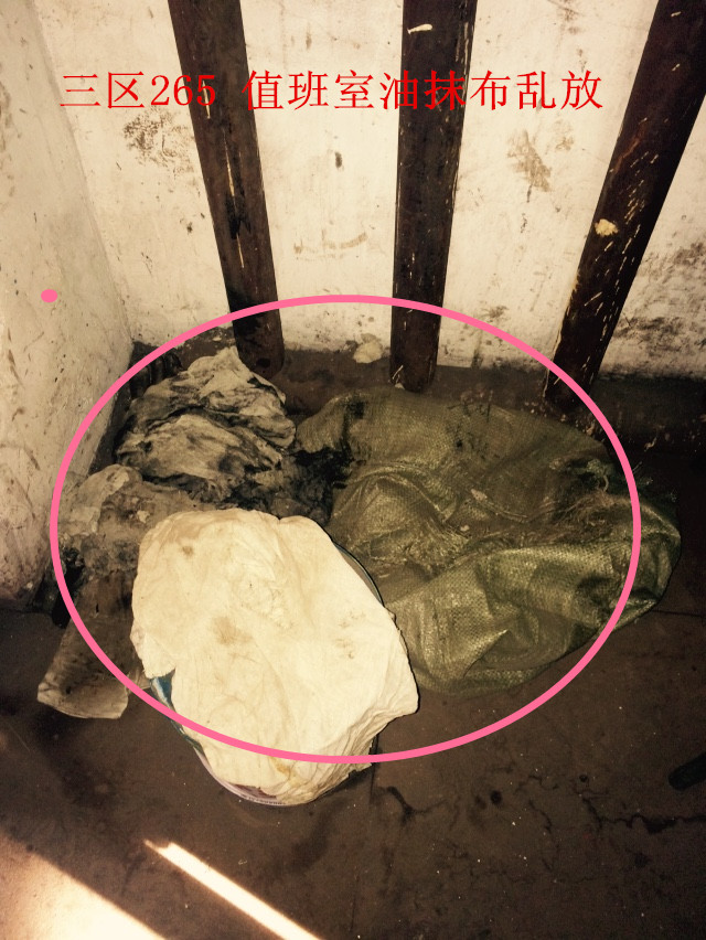 5、三區(qū)265現(xiàn)場值班室油抹布亂放;