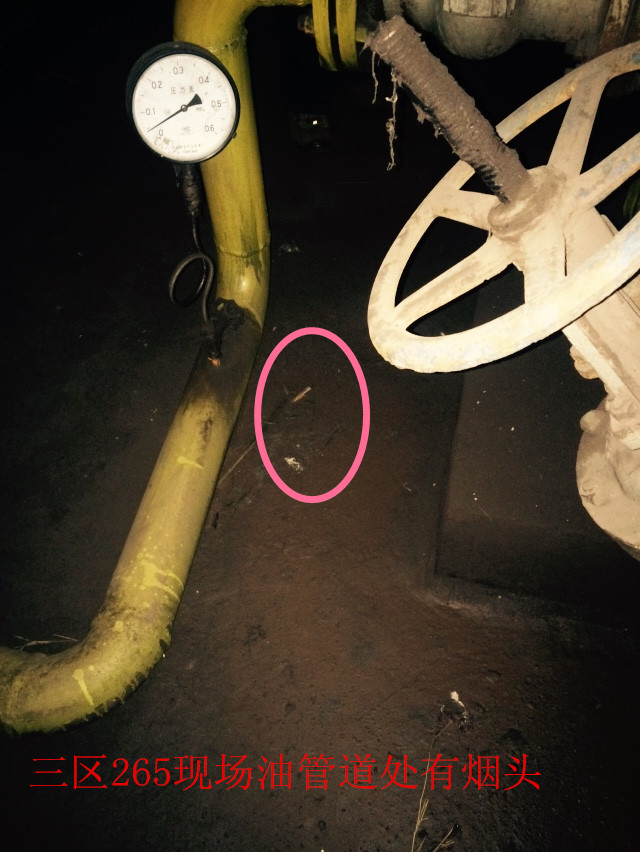 7、三區(qū)265現(xiàn)場油管道處有煙頭;