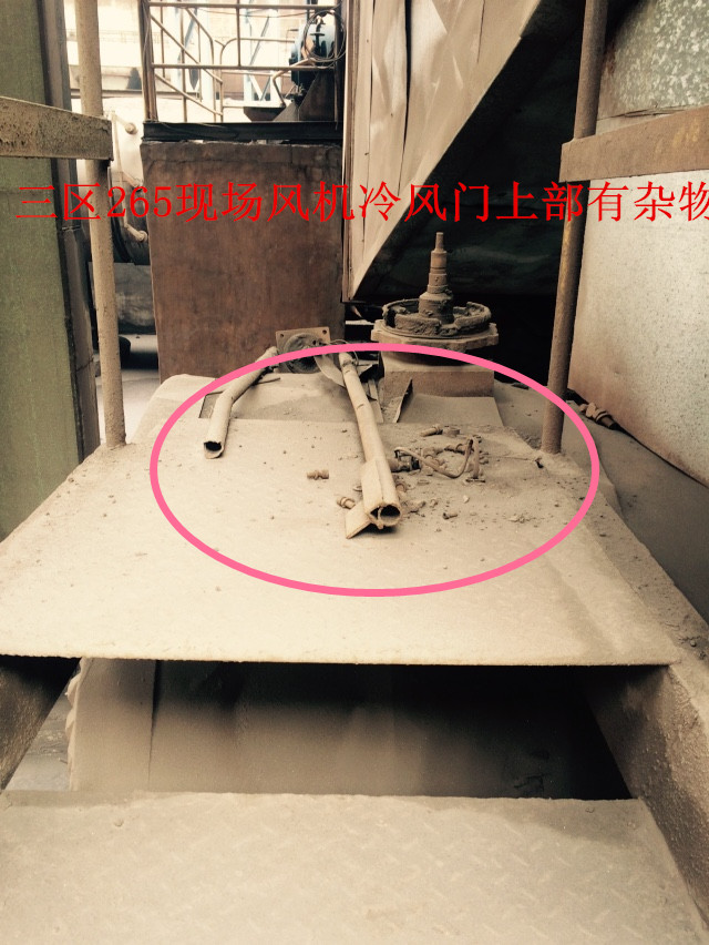 8、三區(qū)265現(xiàn)場風(fēng)機(jī)冷風(fēng)門上部有雜物;