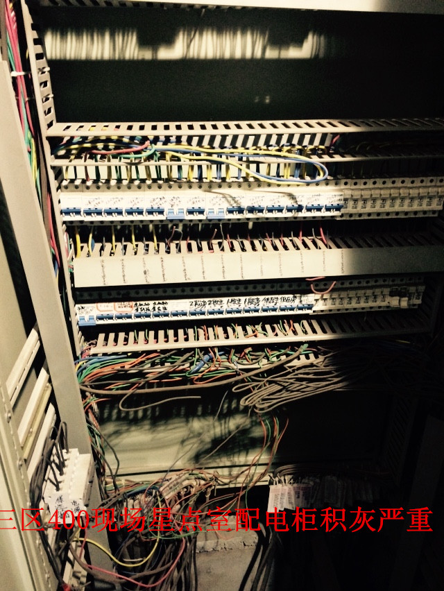 9、三區(qū)400現(xiàn)場星點(diǎn)室配電柜積灰嚴(yán)重;