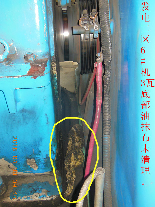 8、發(fā)電二區(qū)6#機(jī)3瓦底部油抹布未清理。