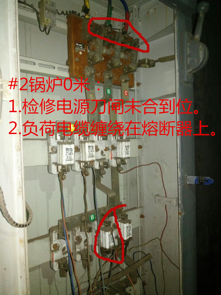 3、2#鍋爐零米檢修電源刀閘未合到位,負(fù)荷電纜纏繞在熔斷器上;