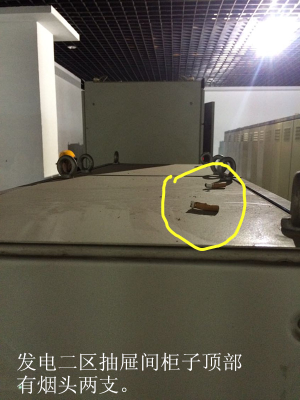 10、發(fā)電二區(qū)抽屜間柜子頂部有煙頭兩支。