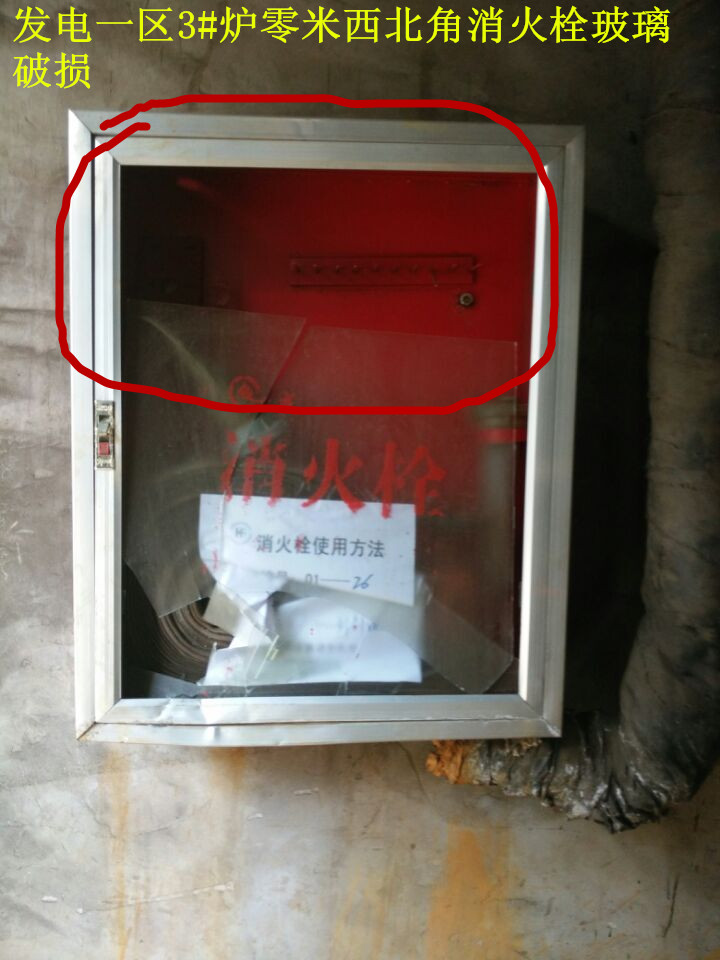 4、發(fā)電一區(qū)3#爐零米西北角消火栓玻璃報損;