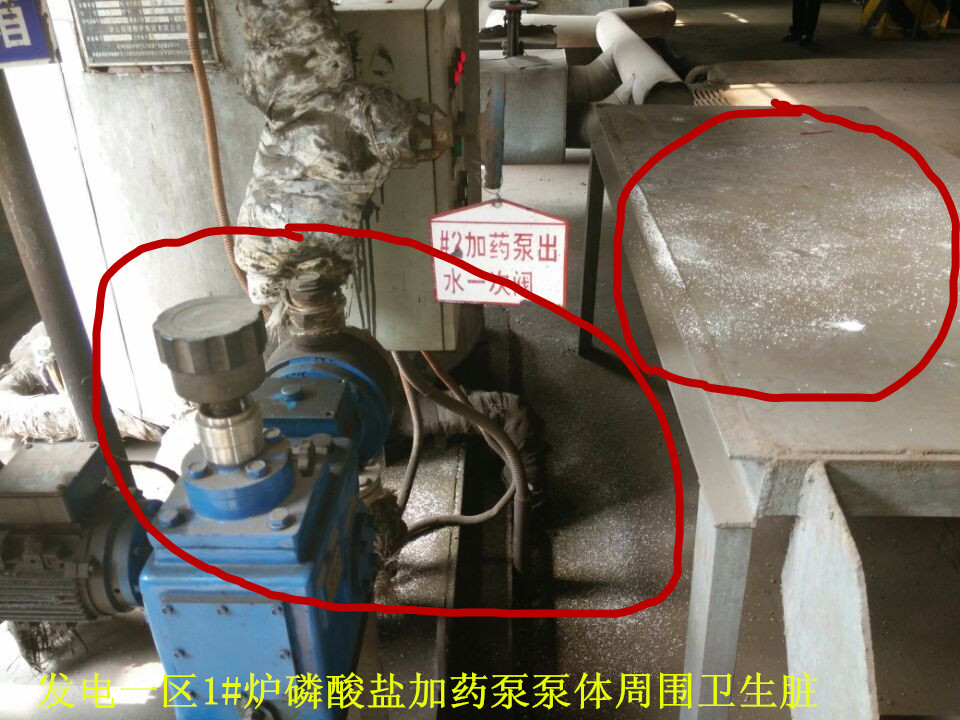 5、發(fā)電一區(qū)1#爐磷酸鹽加藥泵體周圍衛(wèi)生差;