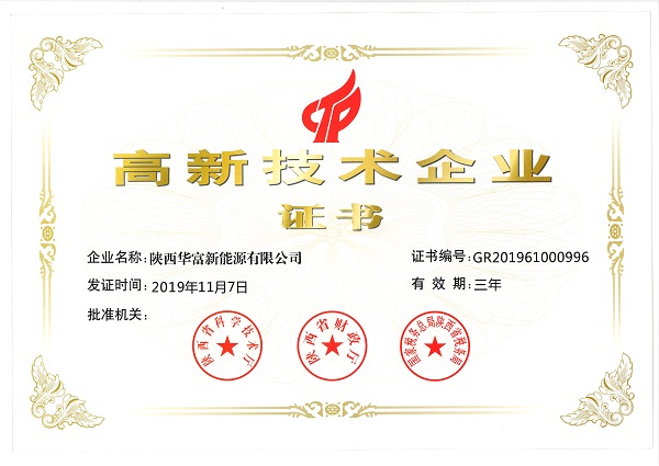 近日,公司收到 “高新技術(shù)企業(yè)”證書,證書編號(hào):GR201961000996, 該證書由陜西省科學(xué)技術(shù)廳、陜西省財(cái)政廳、國(guó)家稅務(wù)總局陜西省稅務(wù)局聯(lián)合頒發(fā),證書有效期三年。國(guó)家高新技術(shù)企業(yè)門檻較高,認(rèn)定須經(jīng)過(guò)嚴(yán)格的測(cè)評(píng)和審批程序,華富新能源公司憑借過(guò)硬的技術(shù)實(shí)力再次榮獲高新技術(shù)企業(yè),這標(biāo)志著公司在研發(fā)和創(chuàng)新方面得到國(guó)家相關(guān)部門的肯定與認(rèn)可。