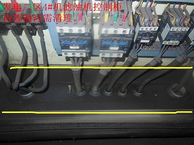 10.發(fā)電二區(qū)4#機濾油機本體衛(wèi)生差,控制柜底部油污需清理;