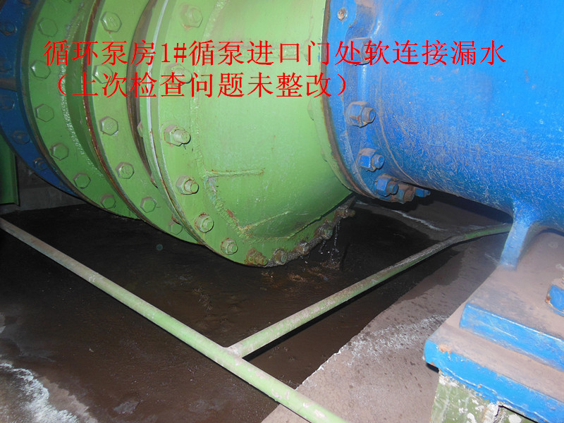 4、 循環(huán)泵房1#循環(huán)泵進口門處軟連接漏水(上周檢查問題未整改);