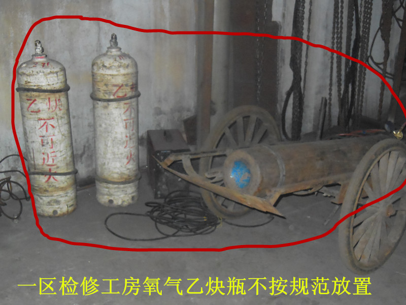 10.一區(qū)檢修工房氧氣、乙炔瓶未按規(guī)范放置;